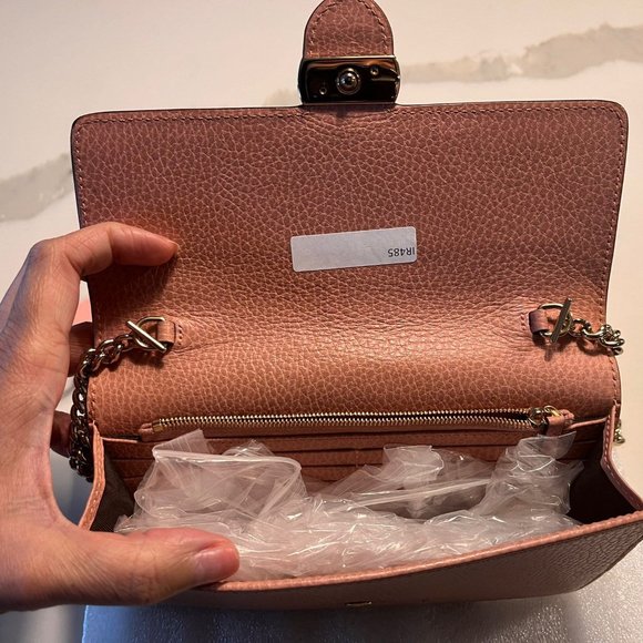 Gucci wallet on chain in blush nude with gold hardware. Brand new, never used. Has slight tarnishing on the hardware and slight marks on leather.