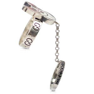 Gucci attached ring set in sterling silver with red, black, and white enamel Boston Terrier ring attached with a thin silver chain to a black crystal-encrusted midi band.