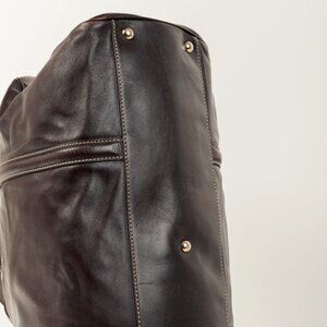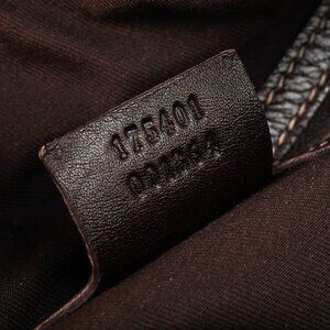 The Britt Boston beg from Gucci is crafted in a dark brown leather, and features gold-tone hardware, two shoulder straps with buckle detailing, protective bottom feet, and the signature interlocking GG logo on the front with green and red striped webbing. The top zip closure has two pulls, and opens to a spacious tonal textile-lined interior containing a gusseted pocket, and a zip pocket.