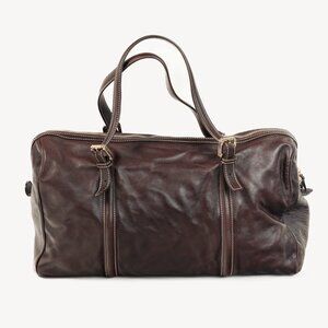 Composition: Leather, webbing, fabric interior, metal hardware.