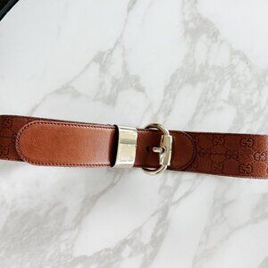 Authentic vintage Gucci leather belt in classic brown with embossed GG logo pattern. Features a gold-tone equestrian-inspired buckle and engraved "Gucci" plaque.