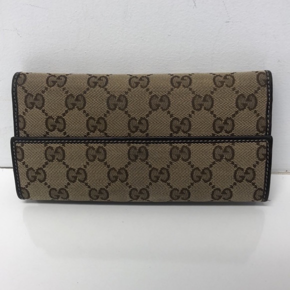 This wallet from Gucci is made in a brown monogram canvas, and features dark brown leather trim, gold-tone metal hardware, and a back flap pocket with a snap closure. The foldover strap opens to a leather-lined interior that contains 7 card slots, two flat pockets, and an accordion compartment divided into two.