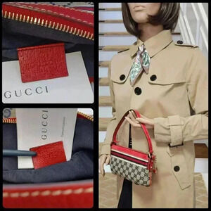 A stylish top-handle bag featuring a durable canvas exterior with a web accent and striking red leather trim. Crafted in Italy, it show cases quality craftsmanship, highlighted by the serial number 145970-001998.