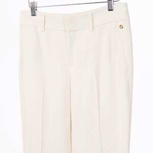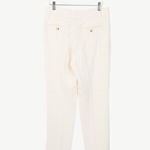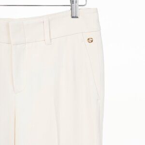 Made in Italy, these trousers from Gucci circa 2012 are crafted in a cream imperial stretch cady crepe, and feature a front double hook and zip fly closure, a banded waist, belt loops, a gold-tone interlocking GG detail on the front left, faux front slash pockets, back buttoned welt pockets, straight-cut legs, and ankle-length hems.