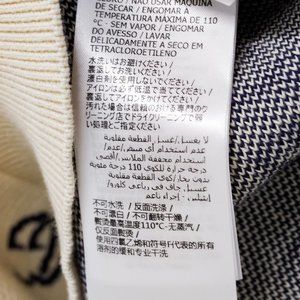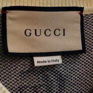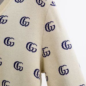 A cream coloured sweater from Gucci featuring the GG monogram in navy knitted throughout, along with a v-neck and a ribbed neckline, cuffs and hem.