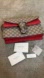 Elegant Gucci bag with beige and red design. Features a chain strap and signature pattern.