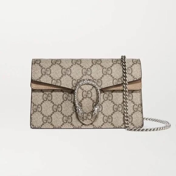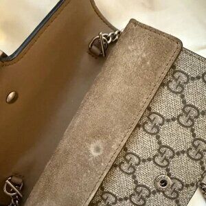 Never used, purchased 2018 at Saks Fifth Avenue. Mini GG Supreme bag with buttery suede, detachable chain strap, and iconic Dionysus hardware. Slight, non-visible suede wear on top flap from closure (pictured). Dustbag included; no box.