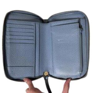 This classic wallet is crafted of richly textured leather in blue. The wallet has a wrap-around light gold zipper that opens to a compact leather interior with a card slot panel, patch pockets, a billfold, and a zipper compartment.