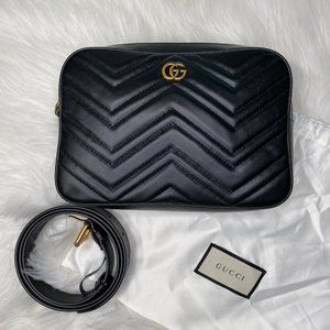 This is the Gucci Black GG Marmont Matelasse Square Belt Bag in black.