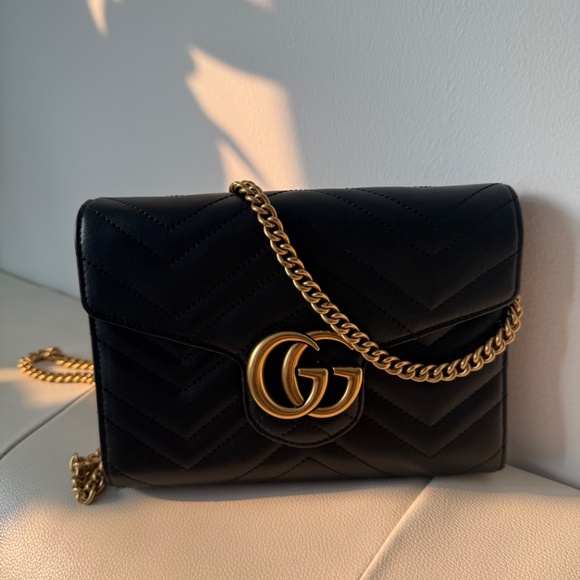 Elevate your style with this iconic Gucci GG Marmont shoulder bag, crafted from luxurious matelassé chevron leather with antique gold-toned hardware. Featuring the signature double G logo, a softly structured silhouette, and a sliding chain strap for versatile wear as a shoulder or crossbody bag. Impeccably detailed and timelessly elegant—perfect for day or evening.