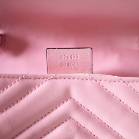 100% authentic. “Gucci” with a trademark symbol and “Made in Italy” stamped on a pink leather tab inside the bag is shown in photo #11. The style and serial codes (476433 584046) stamped on the reverse side of the leather tab are shown in photo #12. Key ring engraved with “Gucci” with trademark symbol and “Made in Italy” shown in photo #9. Snap button engraved with “Gucci” twice is shown in photo #10.