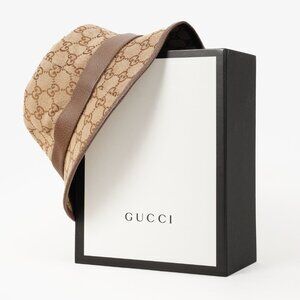 The Gucci bucket hat, expertly crafted from monogram canvas and accented with a tonal leather trim, exudes a vintage feel. Its cotton lining ensures comfort while the iconic Double G adds a touch of luxury. Made in Italy with archival references, it's a statement piece for the fashion-forward.