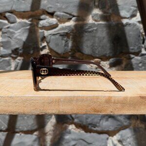 Rectangular frame in brown gradient acetate with transparent amber lower rims. Brown gradient lenses with engraved Gucci signature logo on the right lens. Branches feature the signature interlocking GG logo in gold tone with a brown and gold Diamantissima lattice pattern. Made in Italy. Comes with original brown monogram hard case, cleaning cloth, and Gucci booklets.