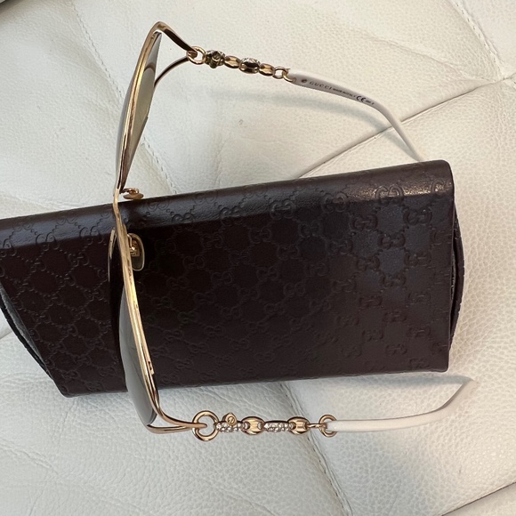 Gently worn, no visible scratches or marks. Gold rims with cut gap sides, slightly oversized vintage Gucci. Adjustable nose pads and Gucci lens quality 100%UVA/UVB protection. Comes with Gucci brown case.