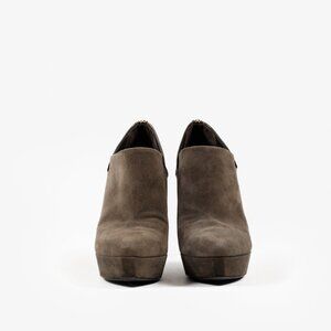 A pair of military-green heeled platform booties from Gucci crafted in a mix of patent leather and suede. These shoes have a point toe, a soft suede upper, a 2.5 cm midsole platform, an angular opening, and a patent leather backing with a gold-tone zip-closure at the back of the heel. The shoes also have a patent leather 10.5 cm heel with a gold-tone decorative wedge between the heel and the top of the outsole.