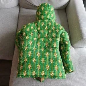 Vibrant Gucci jacket with green and yellow pattern. Hooded design. Stylish and bold.