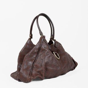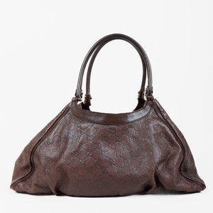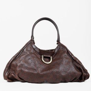 Crafted from Gucci’s GG Guccissima embossed leather in chocolate brown, this chic hobo bag features two rolled leather handles, a light gold-tone brass D ring engraved with the House name at the front, and protective base studs. Secured by a lobster clasp, the spacious interior is lined with soft canvas printed with the Horsebit motif in brown and red and includes a zip pocket.
