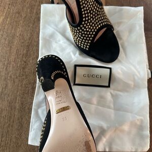 Gently worn heels probably had on 2-3 times, thre is some gentle wear in the bottom. These are comfy and leather, with stud details at the top. They fit true to size for a size 36. All items are authentic as I used to work for Gucci, but no items have recipts as all transactions arr under my profile. Dm if you have any questions! These have dustbags but no box.