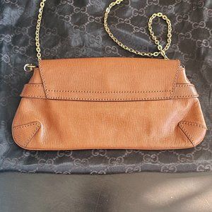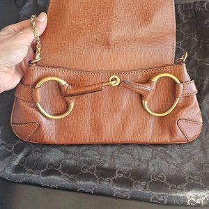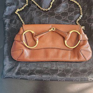 This limited edition Horsebit Clutch/Shoulder Bag in brown leather and gold hardware was made in the 2000s and designed by Tom Ford when he was the creative director of Gucci. The front has a large horse bit detail with a flap. Its inner fabric lining has a patch pocket.