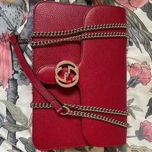 The Interlocking G crossbody bag has a leather fabric, a chain-link shoulder strap, a front flap with gold-tone interlocking GG clasp closure, and an interior slip pocket.