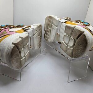 These eye-catching Gucci Journey Flashtrek sneakers feature a unique blend of colors, including pink, yellow, and white, adorned with luxurious turquoise jewel embellishments crystals. With a bold and modern design, these sneakers offer comfort and style, featuring a chunky sole and cushioned mesh material. Perfect for those who want to add a touch of luxury and flair to their casual outfits.