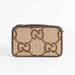 Timeless Gucci Jumbo GG Canvas Mini Camera Bag, designed by Alessandro Michele. Crafted in durable brown canvas with the signature jumbo GG print and web accent, this bag is a blend of luxury and functionality. Perfect for casual outings or adding a touch of elegance to your everyday ensemble.