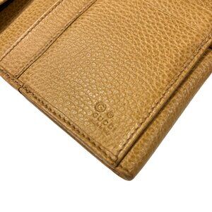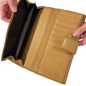 This stylish clutch wallet is crafted of light brown calfskin leather with a frontal flap with a silver stud lined interlocking GG Gucci logo. The flap opens to a currency compartment and the rear strap opens to a brown leather compact compartmentalized interior with card slots and patch pockets. This is a marvelous clutch wallet for everyday use!