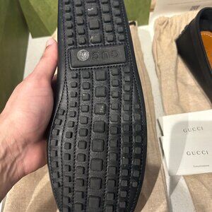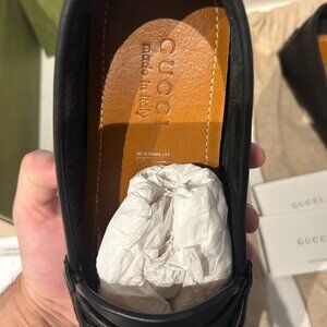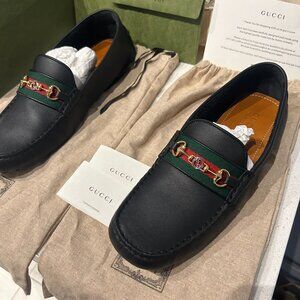 A reiteration of the classic style- Men’s black moccasins from Gucci. Emblazoned with the brand's signature green-red-green Web stripe and a gold-tone horsebit, this leather-crafted pair sits on a black rubber sole.