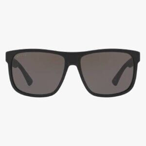 These Gucci Men's sunglasses feature a black acetate frame with grey lenses. The handles are matte style, and the front is more glossy. Rectangle style with a lens width of 58 mm, a lens bridge of 16 mm, and an arm length of 145 mm. Frame type: Full Rim.