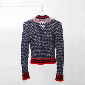 Gucci has done it again. This showstopping metallic cardigan has literally all the trimmings! From the rose metallic lace-like collar to the standard Gucci stripe knit hem, finishing with the large pearl GG adorned buttons , no detail has been missed. This sweater is a size Small and is in excellent condition.