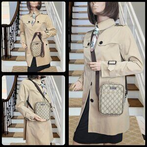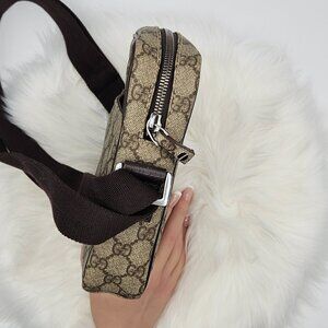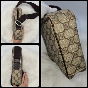 Compact messenger in brown-on-beige coated canvas with dark brown canvas strap and dark silver-tone hardware. Features a front patch pocket and a top zipper (professionally replaced by a cobbler) opening to a brown fabric interior with patch pockets.