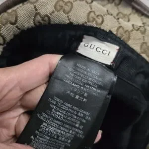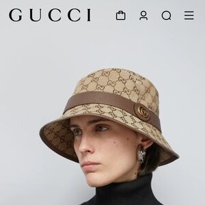 Stylish Gucci bucket hat with iconic monogram pattern. Features a brown leather band with GG logo.
