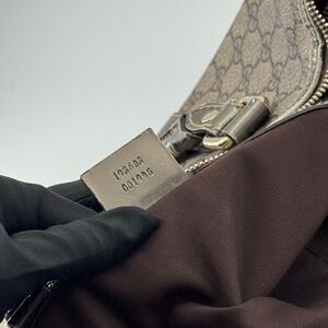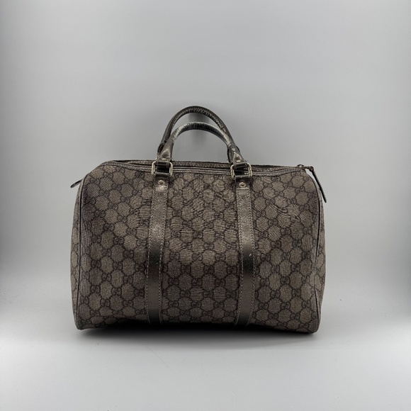 Elegant and timeless Gucci Boston bag crafted from the signature GG Supreme monogram canvas with metallic leather trim and silver-tone hardware. This structured design is both practical and sophisticated — perfect for travel or everyday luxury.