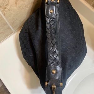 Gucci Monogram GG Black Horsebit handle Canvas Material Hobo Bag, preowned & in great condition. Wear consistent with age and use. Gently Used EXTERIOR: Minor pulls on both sides of the canvas. HANDLE(S): Minor wear. LINING: in great condition; clean. HARDWARE: Minor scratches.