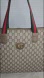 Zip top monogram (PVC)coated canvas, with brown leather trim and the distinctive red and green "Sherry Line" web stripe on the handles.