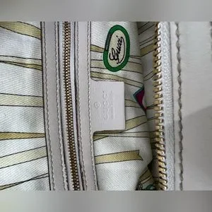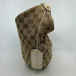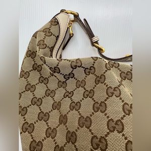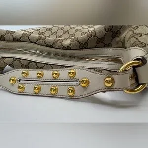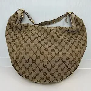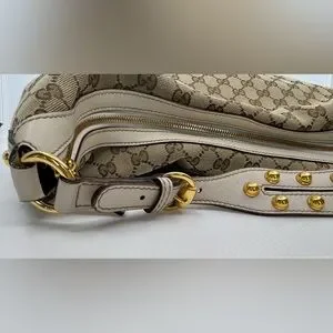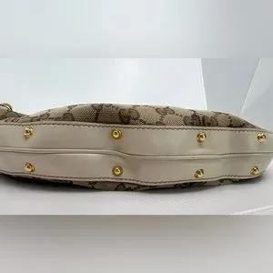Stylish round-shaped hobo bag by Gucci featuring the iconic GG monogram. Crafted from the iconic Gucci Supreme canvas, this large hobo bag features beige leather trims, gold tone hardware, and a toggle gold studded leather handle. The spacious interior is lined with gucci print canvas and features a zip pocket.