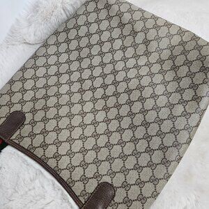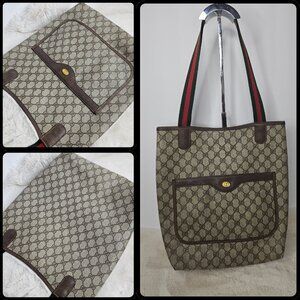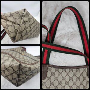 Monogram (PVC)coated canvas, with brown leather trim and the distinctive red and green "Sherry Line" web stripe on the handles.
