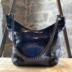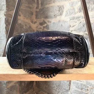 From 2010. Navy blue python skin leather with black reflects. Black smooth lambskin leather lining. Gunmetal tone hardware. Thick chain shoulder strap. GG charm at the end of the shoulder strap. Black patent leather at bottom. Top zip closure. Made in Italy. Comes with its original dustbag.
