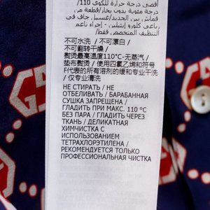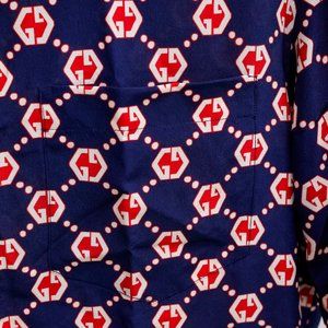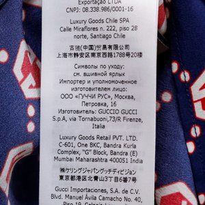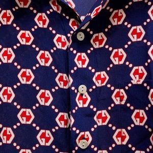 A short sleeve silk shirt from Gucci in navy blue and red featuring the GG monogram throughout, a classic collar, a breast pocket and a partial button-up front.