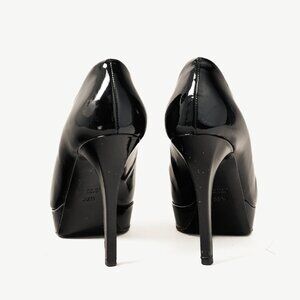 Circa 2009, these Italian-made pumps from Gucci are crafted with the designer's Vernice Crystal leather in a Nero black, and feature covered stiletto high heels, closed square toes, platforms, and leather lining and soles.