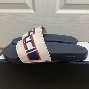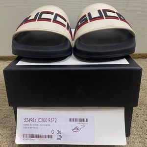 Gucci Off-White St. Nastro Sport Slides, Size US 6