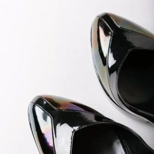 A shimmery black oil slick patent leather pump from Gucci. This style features an almond toe with a leather-stacked platform and a high stiletto heel.
