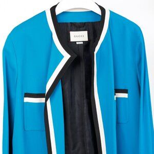 This jacket from Gucci's 2018 Pre-Fall and Winter collection is crafted in a blue stretch viscose, and is trimmed on the edges in blue and white grosgrain ribbon. It features long cuffed sleeves, an open front, a belted waist, multiple front patch pockets, and is lined in a black satin.