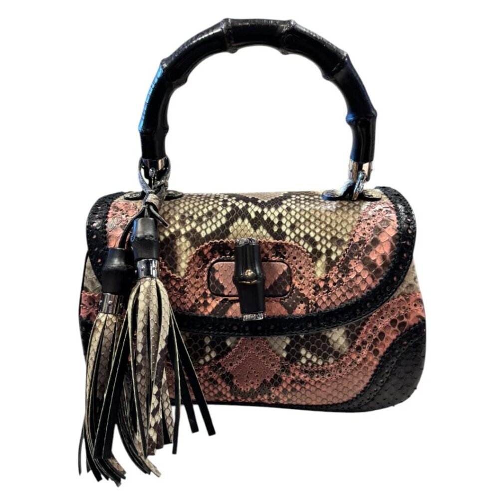 This Gucci Python Purse features a unique bamboo design and stylish tassels, making it a must-have accessory for any fashion-forward individual. Crafted from premium python leather, it offers a touch of luxury and sophistication to any outfit.