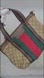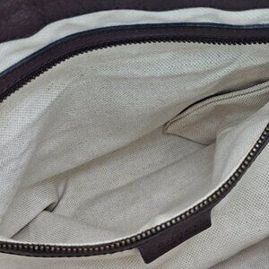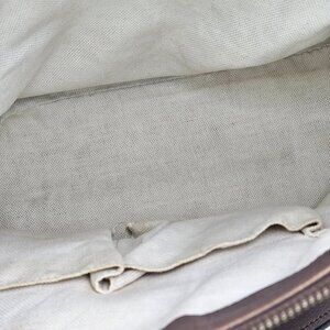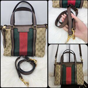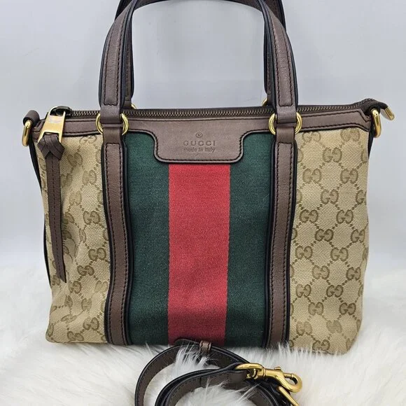 Made from monogram canvas with brown leather trim, this stylish bag is accented by a signature red and green web stripe down the center.