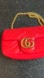 Chic red leather crossbody by Gucci. Features elegant gold chain strap. Iconic GG logo accent.
