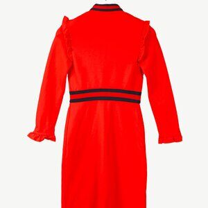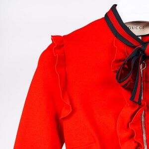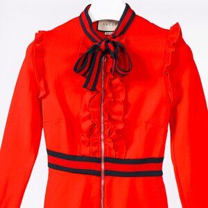 Made in Italy, this dress from Gucci circa 2018 is crafted in a bright red viscose-blend jersey, and is trimmed with striped webbing. It features long sleeves, ruffle cuffs, a mock bow-neck, ruffled trim on the bust, a full front zip closure, an A-line skirt, and a mini-length hem.
