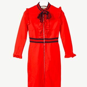Gucci Red Ruffled Stripe-Trim Bow-Neck Mini Dress