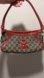 Chic Gucci shoulder bag with iconic pattern. Red accents add a bold touch. Perfect for stylish outings.