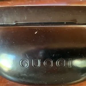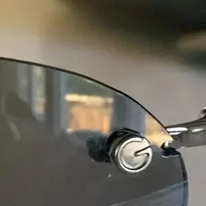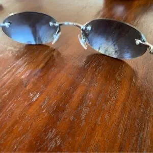 Authentic Elegant rimless unisex design with sleek grey lenses. Silver accents add a modern touch. In excellent condition. No scratches. Includes original case which is beaten up as in pics.